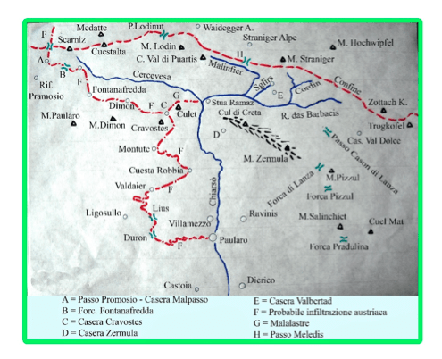 Perché questa precauzione? Perché la direzione che sto per descrivere, cartina alla mano, era uno dei pochi passaggi critici utilizzabili per portarvi un tentativo di infiltrazione garante di esiti favorevoli. Se gli Austriaci fossero riusciti a transitare per il Passo Promosio (Kronhof Törl, m 1770) avrebbero avuto facile accesso a una rapida discesa verso Casera Malpasso (m 1619), al valico di Sella Cercevesa verso Casera Cercevesa, Casera Fontanafredda bassa (m 1541), poi breve risalita verso Casera Dimòn (m 1612) sino al M. Culèt (m 1591) e alla Csta Cravostes (m 1662) a 2500 metri circa in linea d’aria ovest del Cul di Creta.