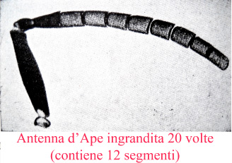 - Le antenne sono formate da 20.000 organi di senso: servono per la comunicazione. Sono l’organo dell’olfatto, del tatto e di percezione delle forme. Si compongono di: 12 articoli (operaie e regina) – 13 (per i fuchi). Gli organi sensori dell’odorato sono: 1.600 (regina), 2.400 (operaia), 18.000 (fuco). Per ogni antenna le fossette auditive sono: 20.000 (operaia). Peli tattili: 13.000 (operaia), 2.000 (fuco).