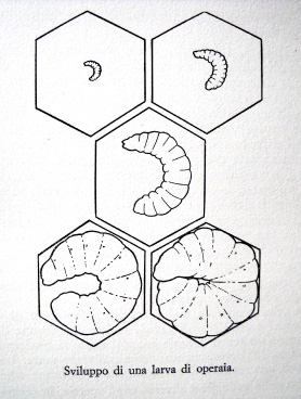 - Dall’uovo all’insetto: dopo 3 giorni dall’uovo nasce la larva; questa è nutrita con pappa reale per 3 giorni se operaia, per 6-7 giorni se regina; al 6°/7° giorno la larva cessa di nutrirsi e si trasforma in pupa (a 6 giorni la larva pesa 500 volte più dell’uovo originale). La permanenza nella cella è di: 21 giorni per l’operaia (3 da uovo, 6 da larva, 12 da larva/pupa), di 16 giorni per la regina, di 24 per il fuco.