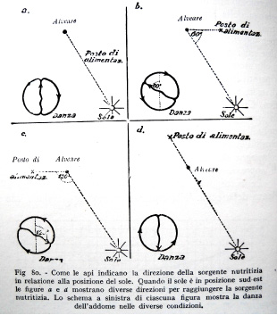 - Durante il volo verso la sorgente di nettare o polline l’angolo fra tale sorgente e la direzione del sole è determinato otticamente. Le bottinatrici devono ricordare tale angolo fino al momento in cui inizieranno la danza e lo devono poi tradurre, con alta precisione, in un angolo rispetto alla gravità, cioè rispetto a una immaginaria linea verticale disegnata sul favo. Esse devono inoltre considerare l’intervallo di tempo esistente tra il volo verso i fiori e il momento della danza e devono tener conto del cambiamento della posizione solare durante questo tempo.