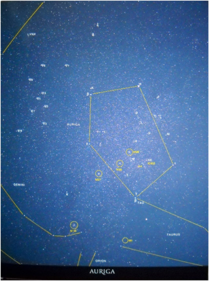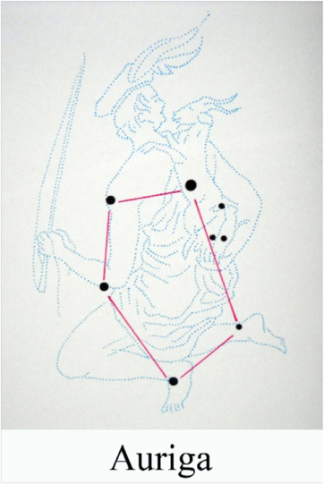 Auriga è parzialmente immersa nella Via Lattea. Il suo esteso pentagono, che segue Perseo nella rotazione della volta celeste, annuncia l’arrivo dell’inverno.