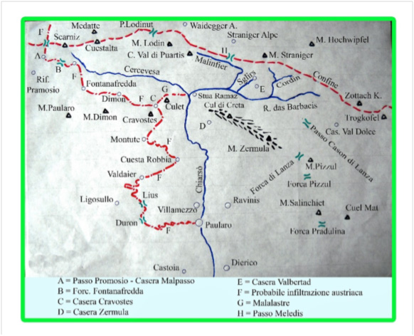 Gli Austriaci avevano effettuato un fortunoso avanzamento spingendo la loro XII brigata da Montagna, tra una serie e l’altra di attacchi di sorpresa e aspri scontri a fuoco, lungo la linea di frontiera. Con una diversione strategica su quei siti le armi austriache avrebbero avuto buon agio nell’esercitare un facile controllo che, da tale linea, poteva essere esteso su tutta la conca di Paularo e che avrebbe consentito di aprire la via alle truppe imperiali per una successiva infiltrazione nella vallata sottostante.