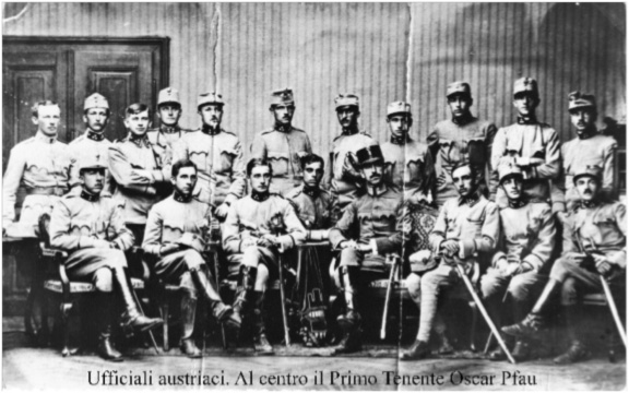 “Mio padre era d’animo buono e sereno, tendenzialmente allegro, nonostante tutti i problemi che aveva dovuto affrontare durante la sua vita. Parlava correntemente quattro lingue: tedesco (sua lingua madre), italiano, ungherese e francese. Le invio, come d’accordo, la fotografia di un gruppo di ufficiali austroungarici in cui mio padre Oscar Pfau si trova al centro della prima fila alla destra del comandante. Nel 1915 mio padre era un primo tenente di ventuno anni, studente di ingegneria al politecnico di Graz. Mio padre ha sempre parlato in famiglia con tanta stima e rispetto del capitano Mario Musso, che lui aveva assistito fino all’ultimo parlandogli in italiano quando era stato ferito gravemente e per cui aveva voluto la sepoltura con l’onore delle armi.