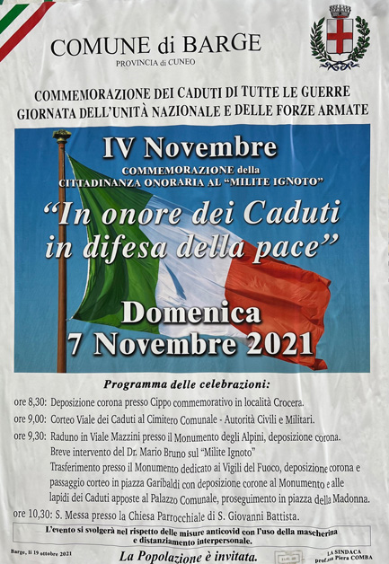 Nel novero delle celebrazioni per rimembrare i sacrifici dei nostri Soldati nel corso della prima Guerra Mondiale e per tributare loro l’onore dovuto ai grandi della Patria, a Barge (prov. di Cuneo) la domenica 7 Novembre 2021 ha avuto luogo una manifestazione in memoria e onore dei Caduti e Dispersi del Grande Conflitto 1915-1918. Presenti la Sindaca Prof. Piera Comba, rappresentanze di Associazioni d’Arma e di Volontariato, il complesso bandistico di Barge e un discreto numero di cittadini. Da sottolineare un momento di sentita partecipazione al senso della celebrazione quando, per richiesta del relatore che aveva terminato il proprio intervento verbale sulla Storia del Milite Ignoto, i presenti si sono astenuti da applausi e, al momento dell’ATTENTI! ordinato dal Capogruppo degli Alpini di Barge, tutti si sono raccolti in rispettoso silenzio commemorativo, per la durata di soli convenuti dieci secondi.