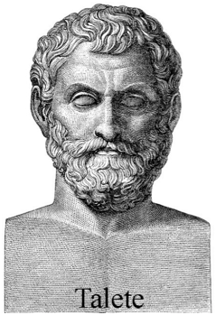 Un poderoso passo avanti e raggiungiamo Talete di Mileto (Talete, 640 o 625 – 548 o 545; il primo, o uno, dei sette Sapienti dell’antichità greca) che, già 600 anni prima di Cristo, arriva a comprendere che la Luna è più vicina alla Terra di quanto lo sia il Sole, dà dunque forma alla profondità dello spazio e in essa colloca la ragione delle eclissi, tanto da creare le condizioni per prevedere l’eclisse solare che si verificò il 28 maggio del 585 a.C., quel fenomeno da tutti ritenuto terrificante e presago di ire divine al punto da decretare l’interrompersi di una cruenta battaglia che al momento divampava tra i Medi e i Lidi (I Medi abitavano le terre che si trovavano nella regione a Nordovest di quello che oggi chiamiamo Iran, fin dal secolo X a.C. – Ciàssare, re dei Medi, dopo aver sconfitto gli Assiri nel 612 a.C. distruggendo la città di Ninive, aveva mosso guerra alla Lidia protraendo il conflitto per diversi anni finché nel 585 fu fissato il confine tra i due Stati al fiume Halys. La Lidia, regione ricca e feconda, estesa dal fiume Halys all’Egeo, godeva di terreni fertili, di floridezza economica, di scambi commerciali avviati al successo e di una forte flotta. Si rammenta la proverbiale ricchezza del re Creso. I Lidi furono i primi a praticare l’arte di coniare le monete e di tingere la lana). Per Talete l’Acqua è il principio unico generatore di tutte le cose. Sua fu l’intuizione che la natura è animata e vivente. Possedeva vaste conoscenze in astronomia e geometria: iscrizione del triangolo in una circonferenza, metodo per calcolare l’altezza di una piramide a partire dalla misura della sua ombra e per calcolare la distanza di una nave dalla costa attraverso le relazioni fra gli angoli.