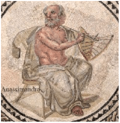 Anassimandro, 610-546, fu discepolo di Talete. Intuì l’esistenza di un “infinito” in cui i contrari si trovano fusi e indistinguibili. L’infinito è anche eterno. Anassimandro nello sforzo di rendere tale elemento più onnicomprensivo, lo identifica nell’Apeiron, l’indeterminato, e avanza una prima ipotesi evoluzionistica (i singoli individui si evolvono dall’Apeiron). Nascere era una conseguenza della separazione dei contrari. La morte era considerata come riunificazione dei contrari nell’infinito. La vita sul nostro pianeta ha avuto origine dal fango marino. L’uomo ha come progenitori i pesci. C’è un altro termine che riesce a spiegare su quale terreno si muoveva il pensiero dei Presocratici, ed è il vocabolo Archè (termine che designa il principio originario di tutte le cose, ripreso in seguito da alcuni fisiologi per indicare il principio immateriale della vita, diverso dall’anima e considerato come la base di tutti i fenomeni vitali), introdotto da Anassimandro della Scuola di Mileto. La Scuola Ionica, nella quale si inseriva Mileto, presupponeva l’esistenza di una materia indeterminata e indifferenziata, capace di racchiudere in sé tutti i contrari, come “caldo-freddo”, “bello-brutto” e così via. Questi contrari, a loro volta, si manifestano nel momento in cui si separano l’uno dall’altro. Così, ad esempio, la nascita di una creatura proviene dalla separazione dei contrari, mentre la morte si manifesta come la loro unificazione in quello che Anassimandro definì Apeiron ossia l’infinito. Anassimandro, nei suoi tentativi di designare il principio originario di tutte le cose, condusse persino ricerche sulla distanza e sulla grandezza relative degli astri visibili, ponendosi il problema del principio di tutto, che andò a risolvere con il concetto di Infinito. Anassimandro coniò quella parola, Apeiron, con la prerogativa di infinito, quasi si trattasse di un contenuto ideale nel quale riporre tutti i problemi con le loro soluzioni palesi, occulte o impossibili. Quasi come parlare di Dio, restando a un concetto senza che nulla se ne sappia della sua vera essenza. Gli viene attribuita l’invenzione dello gnomone o orologio solare che lo portò a scoprire l’obliquità dello zodiaco. Pare che per primo abbia tracciato una carta del mondo allora conosciuto.