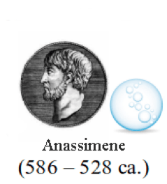 Anassimene 586-528, ultimo rappresentante della Scuola di Mileto, discepolo di Anassimandro. Riconduce tutto all’elemento aria che si muove come un gigantesco respiro dando origine al fuoco se più rarefatta, all’acqua e successivamente alla terra se più condensata. Anassimene ricerca il principio nell’aria, non solo nel suo significato meteorologico, ma anche in quello di spirito vitale, anima.