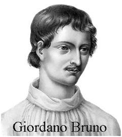 Giordano Bruno (1548-1600). La Terra nel proprio spazio non è più pesante del Sole. Essa ruota (v. Filolao, 450) attorno al proprio asse, rivoluziona attorno al Sole, il suo asse è inclinato, i suoi moti non sono perfettamente circolari, i due emisferi presentano scambio di posizioni. Non esiste misura né differenza fra la parte e il tutto. L’Universo è uno, infinito, indivisibile, da cui discende che il centro dell’Universo è in ogni luogo e la sua circonferenza la si ritrova dappertutto.