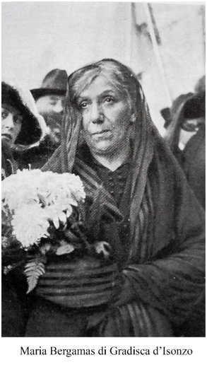 Maria Bergamas, umile figlia del popolo, aveva perso in guerra il figlio Antonio (Toti), classe 1891. Al termine della Grande Guerra fu chiamata a scegliere, fra le undici bare contenenti i resti di soldati senza nome, posate nella Basilica di Aquileia, quella che sarebbe stata la Sepoltura del Milite Ignoto presso l’Altare della Patria a Roma.