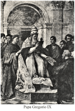 Federico II, tuttavia, non se ne diede per inteso e si attirò l’ira del papa, culminante nella scomunica dell’anno 1227. Alla fine una scappata a Gerusalemme la fece sul serio ma, al suo ritorno, trovò la ribellione nel Mezzogiorno dove il papa aveva inviato le truppe pontificie. Ci furono scontri armati, conclusisi con un compromesso stipulato con Gregorio IX nel 1230 a San Germano. Federico II ebbe vi libera a estendere al resto dell’Italia il regime instaurato nel Mezzogiorno. Nondimeno dovette vedersela, ancora una volta, con la ferma ostilità del papa il quale non ci pensò due volte ad aizzargli contro i vecchi avversari che costituirono il partito dei Guelfi, contrapposto a quello dei ghibellini imperiali. Federico II, in quell’epoca, ebbe un bel da fare per sedare rivolte in Germania, rivalità fra Guelfi e Ghibellini tedeschi. Fu nuovamente scomunicato dal papa che mosse contro di lui una guerra santa. Dopo la morte di Gregorio IX e del suo successore Celestino IV, avvenute nello stesso anno 1241, fu eletto papa Innocenzo IV (1243-1254). Questi, proseguendo la lotta protratta dai suoi predecessori, raggiunse Lione dove tenne un concilio con il quale, nel 1245, scomunicava e deponeva l’imperatore.
