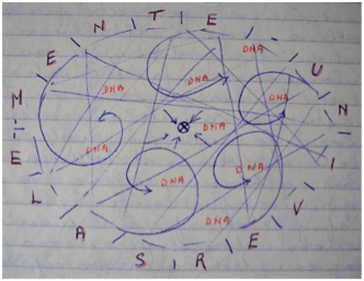 I robot e le macchine non sono dotati di DNA, non sono fatti di materiale biologico, non annoverano al loro interno processi biochimici specifici. Si potrebbe anche ipotizzare che l’intenzionalità stia nel DNA. Ma, poi, qual è l’origine del DNA? Mi spingo oltre: chi l’ha programmato e perché? Gli stati mentali, trascinando con sé e sviluppando intenzionalità e autocoscienza, aprono le porte all’infinito: l’immaginazione, il pensiero laterale, le ipotesi, le congetture. In quanto al DNA posso azzardare una definizione al limite del metafisico: un recettore-convertitore biologico di un flusso di energia universale a spirale che corrisponde al “significato” ultimo.