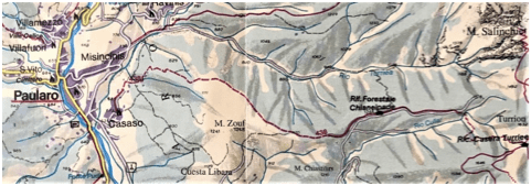 Non lontano da Paularo, il centro carnico che rammenta le gesta del capitano Mario Musso M.O.V.M. e del battaglione Saluzzo, si erge una serie di cime culminante nella vetta maestosa e imponente del Monte Sernio (m 2.187). Siamo a circa cinquemila metri a est di Paularo, sulla displuviale che collega, da nord a sud, le cime dei Monti Salinchiet (m 1.857), Cullar (o Chiaf da l’Omp,m 1.764) e Palon (m 1.707).