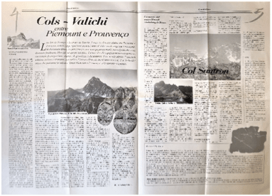 Il secondo contributo di cui dispongo, apparso ancora sul periodico Coumboscuro, porta il titolo di “Cols, Valichi entre Piemount e Prouvenço. L’articolo è così presentato: “Lou liri de Franço e la crous de Savoio”. Lungo la dorsale alpina tra Piemonte e Provenza, antichi cippi riportano ancora i simboli delle casate angioine e savoiarde. Michelangelo Bruno ha percorso per una vita questo territorio transalpino, che ora è diventato finalmente libro (di cui qui un estratto). Parlare di colli significa incontrare la storia, raccontare di emigrazione, eserciti, di grandezza e decadenza di un mondo alpino. L’opera in edizione italiana e francese, concretizza l’intesa editoriale tra Coumboscuro C. P. e Gribaudo, intesa che proietterà la collana “Entre Piemount e Prouvenço” a livello internazionale.
