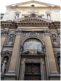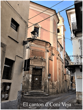 Poco a monte del portone testé citato, all’angolo fra via Amedeo Rossi e via Dronero appariva il frontale di una chiesa, sempre chiusa, attrezzata con una breve scalinata di accesso. Su quei gradini, rammento, nelle sere calde d’estate si ponevano a sedere i vicini, scesi dai loro appartamenti per scambiare quattro chiacchiere e infilare nell’arco qualche pettegolezzo. Quello era il cantòn ossia l’angolo fra le due vie nominate, ed era il perno per i nostri giochi a rincorrerci di bambini di quegli anni.