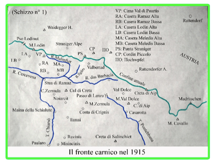 In Carnia. Il 5 luglio giungeva comunicazione che nel corso della mattinata gli Austriaci avevano attaccato il fronte fra passo Avostanis e passo Promosio. Per precauzione e per mantenere il collegamento fra il battaglione Saluzzo e il Borgo San Dalmazzo il maggiore Piglione comandò alla 21a compagnia alpina di occupare il fronte Segnale quota 1579 sino alla confluenza del rio Malinfier con il rio di Lanza, e alla 80a di trasferirsi a casera Zermula per sorvegliare il fronte fra il rio di Lanza e la punta Cul di Creta. Alla 22a affidò la sorveglianza del fronte Pradulina – Cuel Mat.