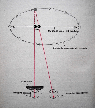 Fig. 6. Adattamento dell’occhio all’oscurità: effetto pendolare di Pulfrich (da provare a casa). Guardate il pendolo con entrambi gli occhi, coprendone però uno con un vetro scuro ma trasparente (vetro da occhiali da sole, pellicola fotografica). Si scoprirà che il pendolo non descrive un arco, ma un’ellisse, perché l’occhio schermato fa giungere il messaggio in ritardo al cervello rispetto all’altro occhio.
