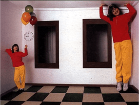 Nella camera distorta dell’Americano Adelbert Ames (1946): la stanza appare di forma rettangolare. Il cervello fonda il proprio processo percettivo su una scommessa formulata in base alle prove di cui dispone; in realtà il soffitto, più si spinge in profondità, più aumenta in distanza verticale dal pavimento.