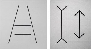 La figura di Ponzo (binari) e la freccia di Muller-Lyer. Quale barra è più lunga fra quelle poste fra i binari? Nella figura a destra: qual è il segmento di retta più corto?