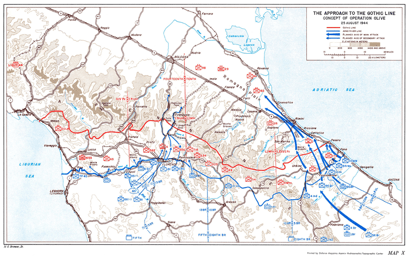 Il 15 agosto inizia l’operazione “Anvil” ora chiamata “Dragoon”. Il generale Patch, comandante delle forze terrestri di “Dragoon”, espone su una grande carta il piano d’invasione della Provenza. Nella notte dal 25 al 26 agosto l’8a Armata ha il sopravvento sulle divisioni 71a Fanteria e 26a corazzata. Il 31 agosto i Tedeschi abbandonano la prima posizione della linea Gotica. La 1a divisione canadese sottomette Rimini e gli Americani prendono il colle della Futa, nota posizione chiave. Alla fine di settembre l’8a Armata è a Pesaro.