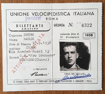 Le foto che mi ritraggono riguardano: il tesserino dell’U.V.I. rilasciatomi nel 1956, all’inizio della mia attività agonistica che durò tre anni, due come allievo e uno come dilettante, sino alla mia chiamata alle armi per la frequenza al XXIII Corso AUC-1959. Poi la prima in bici mi ritrae al seguito di un concorrente nella gara per allievi, a Pianfei (CN), 26 agosto 1956; infine la foto in solitaria: durante la gara di Vignolo (CN), 1956, per allievi e dilettanti.