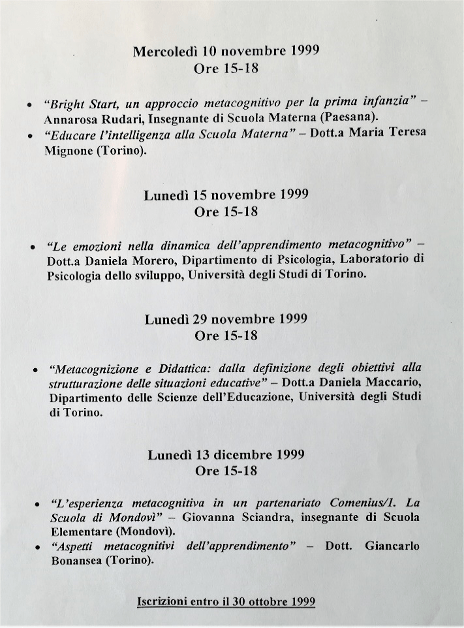 - “Penso…dunque cresco”. Corso conclusivo in contesto metacognitivo. Paesana. Relatori vari. Novembre-Dicembre 1999. Durata: 12h.