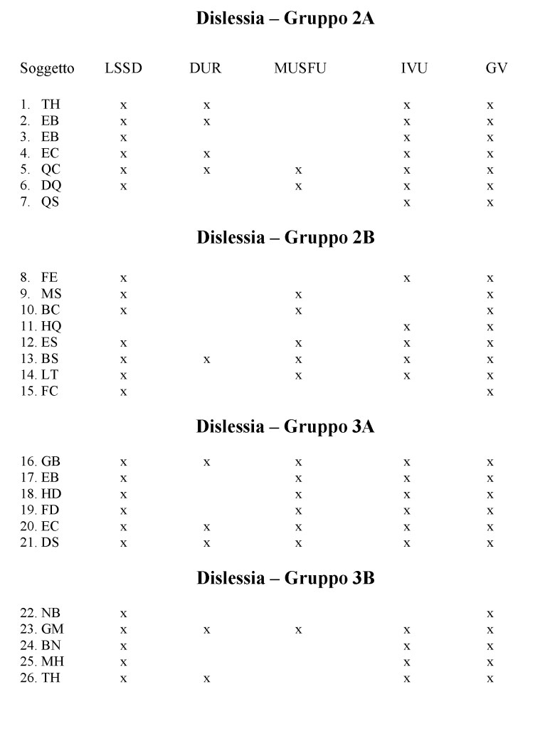 Prima di passare oltre accenniamo ancora al fatto che i gruppi “disgrafia” restano tali e quali per tutta la durata del training, mentre invece i gruppi “dislessia”, dal momento che possono annoverare variazioni di percorso al loro interno, richiedono l’inserimento di una verifica verso la metà dell’anno scolastico. Abbiamo infatti previsto due sole verifiche per l’attività di scrittura, l’una all’inizio, l’altra al termine dell’anno scolastico. Per l’attività di lettura, diversamente, si va a frapporre una verifica intermedia che può dare risultati tali da indurre variazioni in quella che è stata la formazione iniziale dei gruppi. La stessa cosa succede per le classi prime che saranno sottoposte anch’esse al re-test di analisi-fusione sillabica a metà anno. Torneremo su questo punto quando parleremo in particolare delle verifiche.
