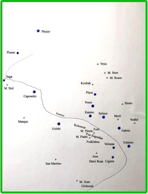 La seconda congiungeva il Kozliak con le località di Pleca, Vrsno, Kamno, Selisce, più a ovest, tutte sulla sinistra dell’Isonzo, come dire, pronte per la partenza. La linea avanzata era, sì, pericolosa per la prossimità agli schieramenti avversari, ancor più per la limitazione numerica che le era stata imposta. È tuttavia da dire che quelle poche forze dislocate così in avanti non avevano il compito precipuo di scontrarsi con il nemico, alla ricerca di una vittoria improbabile sul campo: sarebbero state quasi sicuramente massacrate e annientate. Al contrario, toccavano loro soprattutto doveri di vigilanza e di segnalazione per poi riunirsi, in caso di sopraffazione nemica, alla linea di difesa.