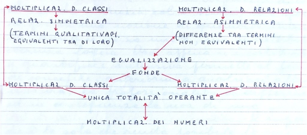 L’egualizzazione delle differenze conduce alla suddivisione e alla composizione di unità divenute numeriche. Mentre la moltiplicazione delle classi e quella delle relazioni costituiscono due operazione ben distinte, che consistono nel mettere in corrispondenza una, dei termini qualitativamente equivalenti tra loro e, l’altra, delle relazioni asimmetriche (di differenze) tra termini non equivalenti, basta egualizzare queste differenze per introdurre l’equivalenza tra i termini stessi di queste relazioni e per fondere così la moltiplicazione delle relazioni e quella delle classi in un’unica totalità operante, che non è altro che la moltiplicazione dei numeri. Una volta di più, quindi, il numero appare come la sintesi della classe e della relazione asimmetrica o, ciò che è lo stesso, della relazione simmetrica (eguaglianza) e delle differenze (relazioni asimmetriche).