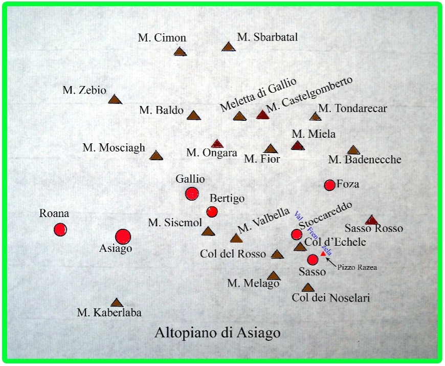 “Le alture si presentavano così: a destra il Col d’Echele, sul bordo precipitoso di Val Frenzela, tutto pieno di annidamenti di mitragliatrici; più a sinistra il Col del Rosso; più a sinistra ancora, il Monte Valbella, più alto degli altri. Al di là di queste cime da espugnare passa la strada delle Portecche, l’arteria dei rifornimenti nemici. Lungo la Val Frenzela scende la strada di Stoccareddo, altra via di affluenza avversaria sul Col d’Echele, Bisognava bloccare queste strade. A destra questo compito fu affidato agli alpini, che hanno fatto prodigi. Già da qualche settimana sottili reparti alpini avevano ripassato la Val Stagna, e inerpicatisi sulle rocce paurose del bordo del Sasso Rosso (1196 m), avevano ripreso le scogliere fantastiche del Cornone (1065 m, poco a sud del Sasso Rosso), che strapiombano sulla Val Brenta.