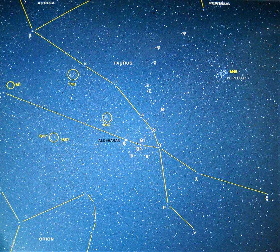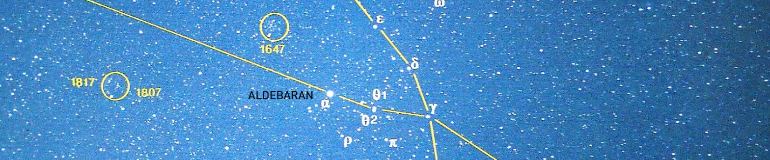 - Il 17 aprile alle ore 21 la falce di Luna si poserà sull’Eclittica, poco a Nord di Marte; più in basso (Sud) la stella Aldebaran. A sinistra (Est) del Toro la costellazione di Orione.