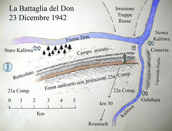Lungo la piana che fiancheggia il Don si percepivano, all’inizio del dicembre 1942, segnali di minaccia per le nostre formazioni. A un certo punto, sul lato destro degli avamposti si scatenò l’inferno. Stava per cedere, sotto la pressione russa, il saliente di Novo Kalitwa, quando giunsero di rinforzo due battaglioni tedeschi e la 22a compagnia alpina del battaglione Saluzzo. Si presentò un intero giorno di lotta feroce per gli Alpini che non intendevano cedere agli attaccanti. Furono i reparti della 22a compagnia e parte dei tedeschi a proteggere il ripiegamento dei Fanti della divisione Cosseria che rischiavano di rimanere accerchiati nell’abitato di Novo Kalitwa. I difensori del caposaldo denominato Pisello furono costretti ad abbandonare le posizioni tenute, mentre la 22a compagnia trovò sistemazione fra i dossi di un imponente calanco. In seguito, sull’orlo di questo calanco, presero posizione alcuni battaglioni della divisione Julia: fra questi, il battaglione Tolmezzo che rimpiazzò sul posto la 22a compagnia assai provata dalla furiosa azione precedente. Era sopraggiunta la notte del 23 dicembre, l’antivigilia del Natale 1942, allorché i russi sferrarono un improvviso attacco contro i capisaldi tenuti dagli Alpini del Saluzzo. Tutta la notte imperversò la lotta. All’alba si contarono oltre duecento morti a poca distanza dei reticolati antistanti alle trincee dei nostri Combattenti. Fra questi si annoverarono un morto e sei feriti.