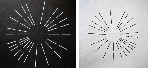 - Nella figura qui a lato abbiamo un insieme a raggi spezzati, che producono contorni illusori e regioni più bianche del bianco di fondo e più nere del nero di fondo.